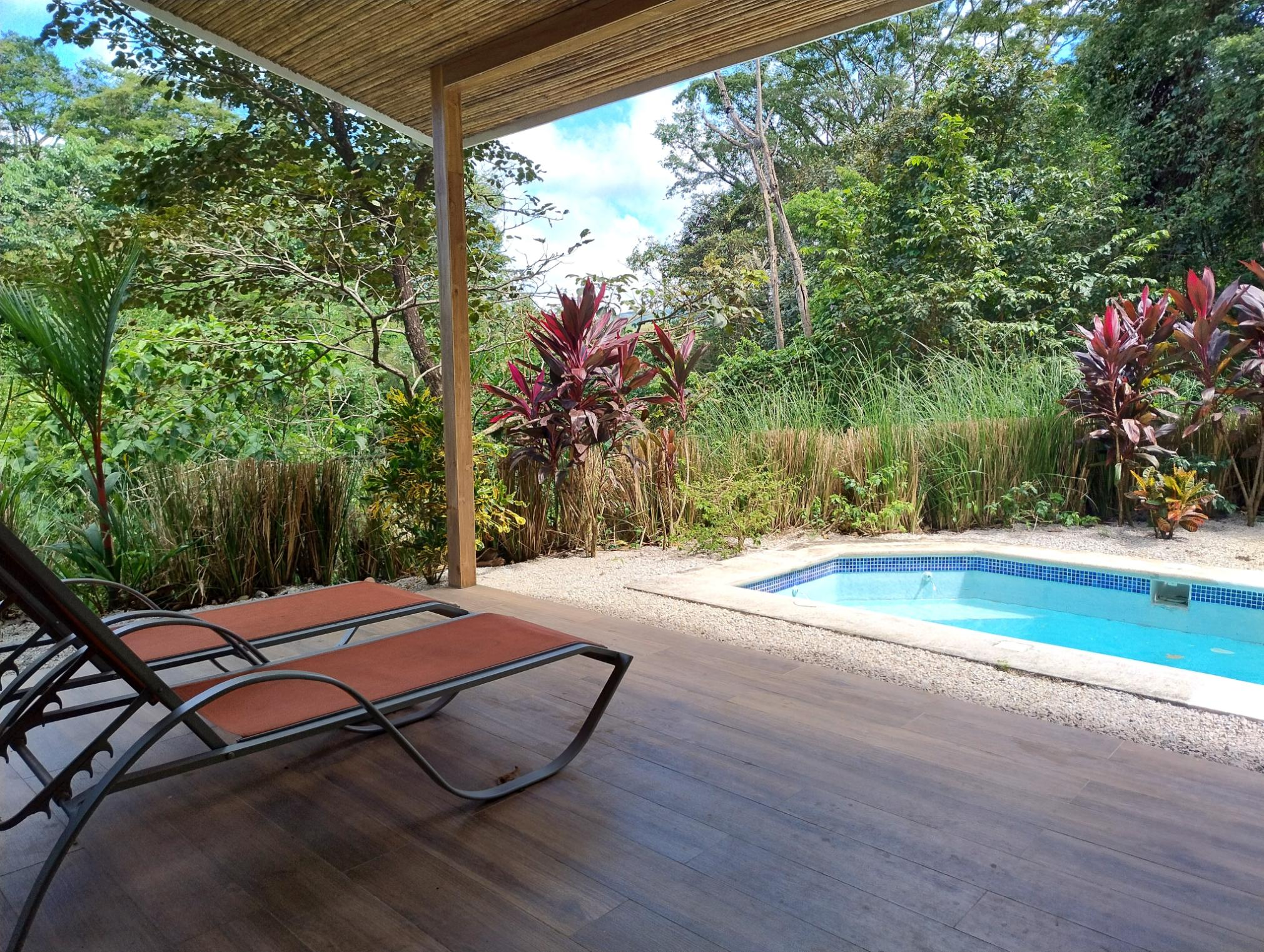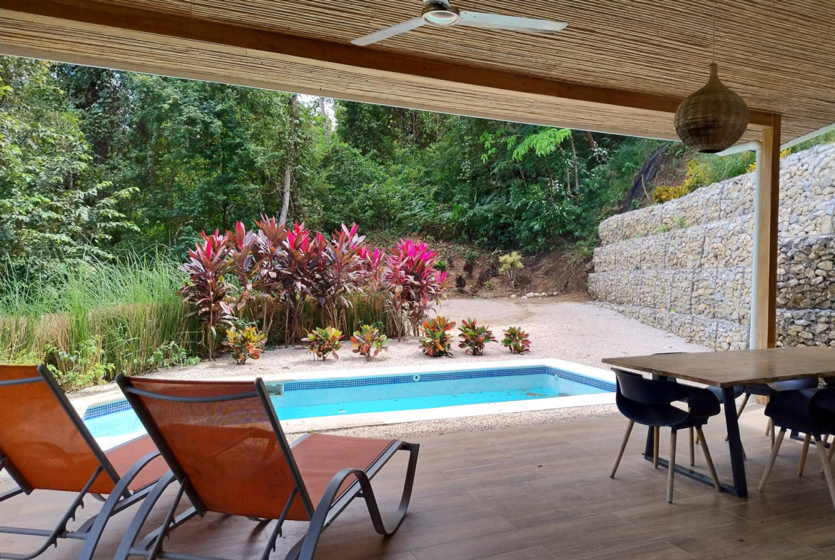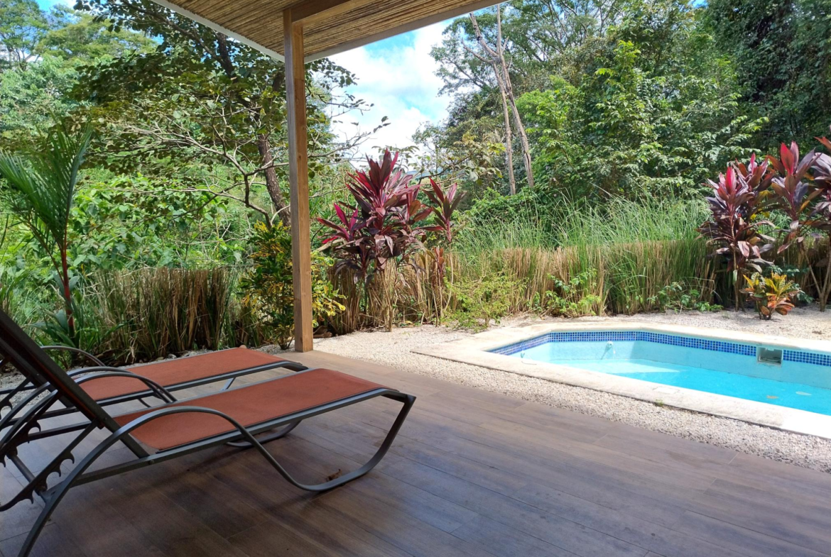Playa Samara Modern 3 BR house with Pool and Guesthouse for sale. Where modern elegance meets serene jungle living, this home is nestled above a quiet road, offering the perfect blend of seclusion and convenience just a short drive from Samara town.