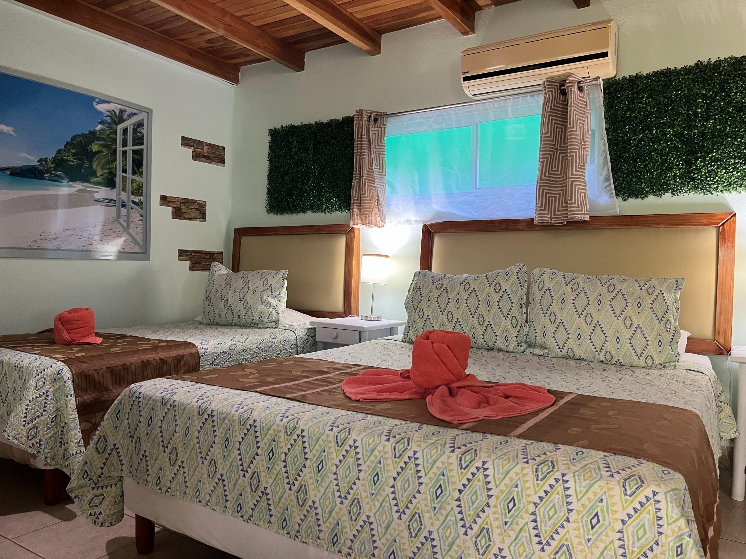 All rooms are equipped with: air conditioning, ceiling fan, mini fridge, TV, coffee maker, hot water, and complete bathroom amenities including towels and toiletries.