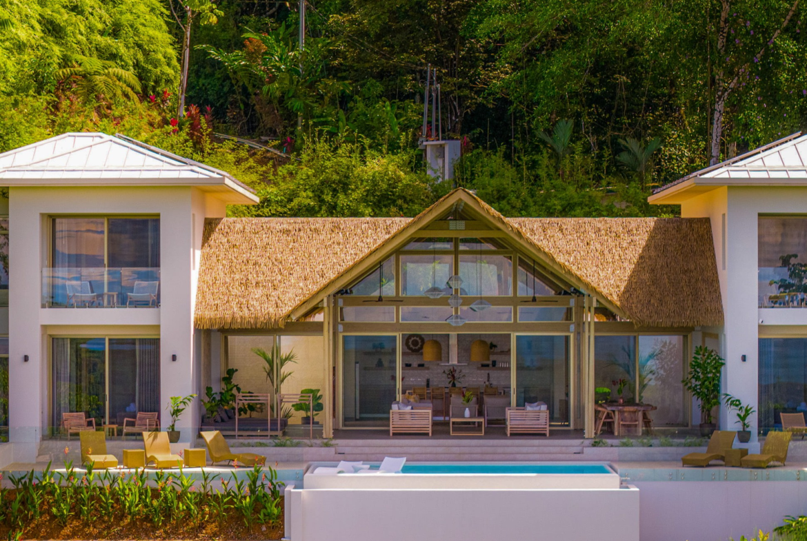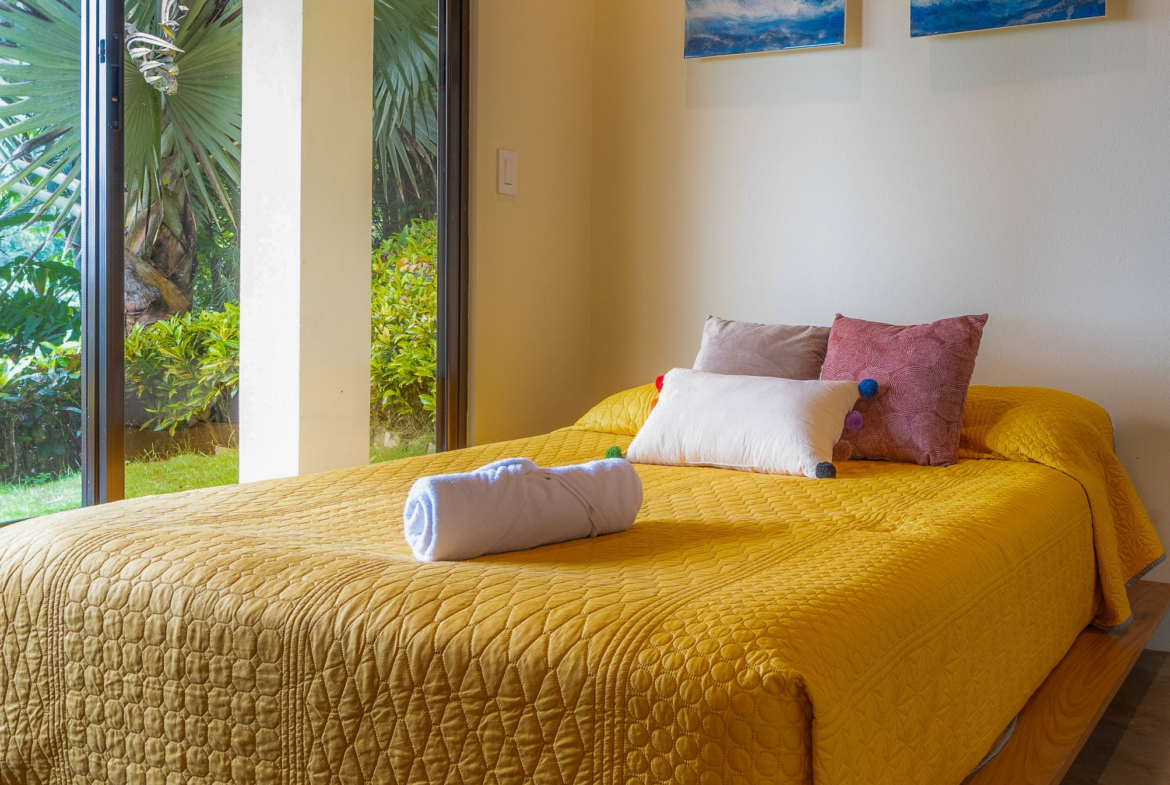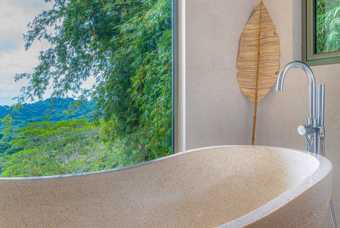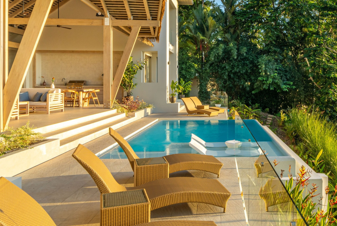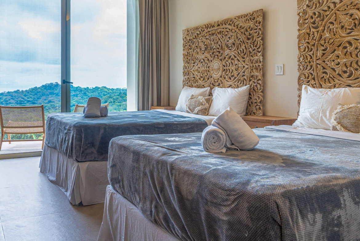 The principal residence is a four-bedroom luxury home built by one of Costa Rica’s most trusted national builders. The owner and architect shaped the design with a clear goal: to bring the landscape into every moment of daily life. The main living room rises to a vaulted ceiling that reaches roughly 27 feet, amplifying the light, the air, and the sense of space. High ceilings, clean lines, and wide openings are all placed to draw your eye toward the Pacific or into the canopy where monkeys, toucans, and butterflies move from branch to branch. The flow between inside and outside is effortless, and the craftsmanship is evident in every finish and detail.