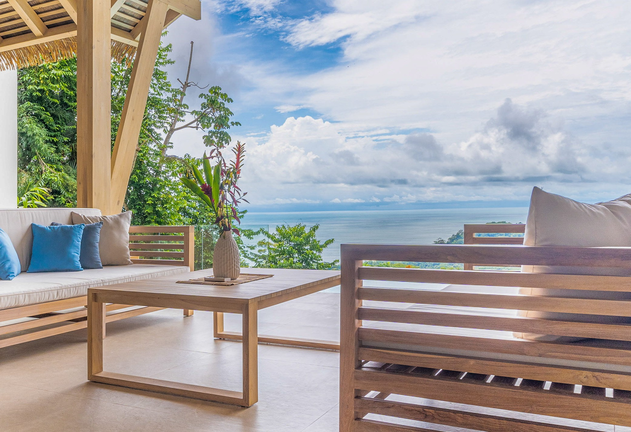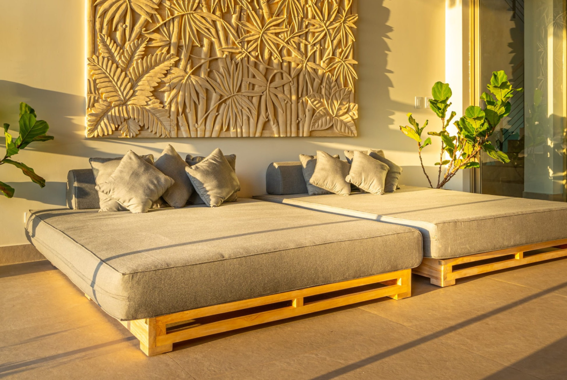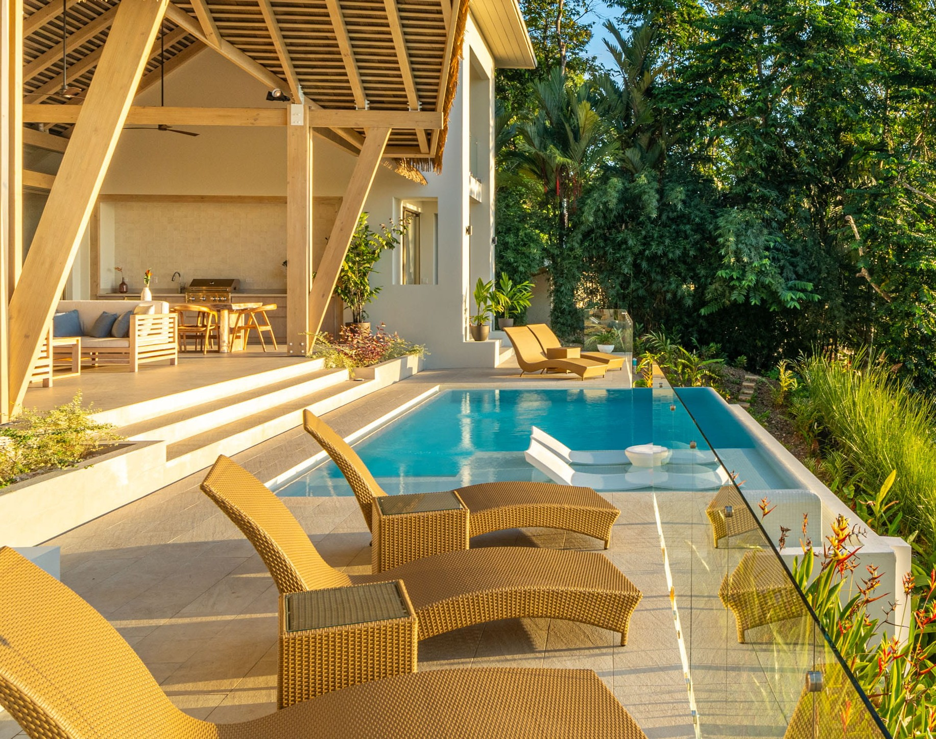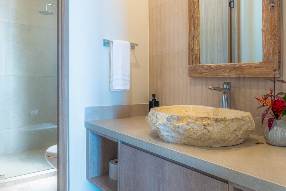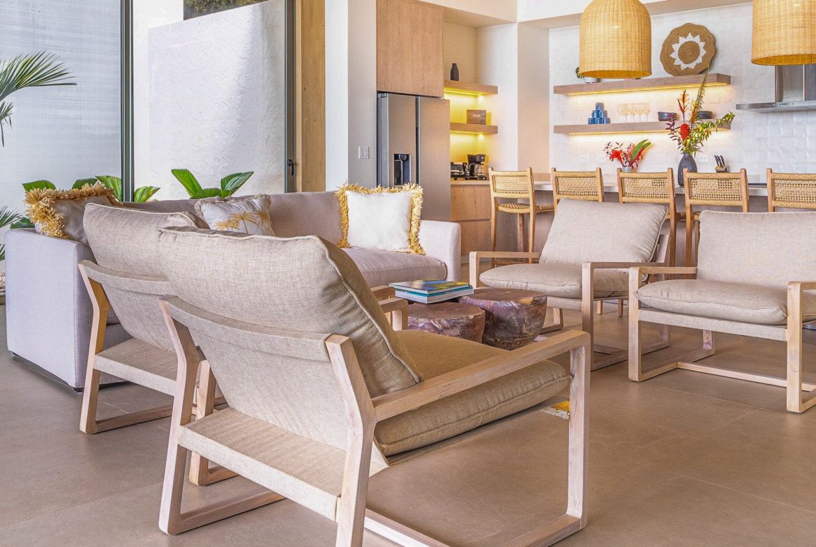 The principal residence is a four-bedroom luxury home built by one of Costa Rica’s most trusted national builders. The owner and architect shaped the design with a clear goal: to bring the landscape into every moment of daily life. The main living room rises to a vaulted ceiling that reaches roughly 27 feet, amplifying the light, the air, and the sense of space. High ceilings, clean lines, and wide openings are all placed to draw your eye toward the Pacific or into the canopy where monkeys, toucans, and butterflies move from branch to branch. The flow between inside and outside is effortless, and the craftsmanship is evident in every finish and detail.