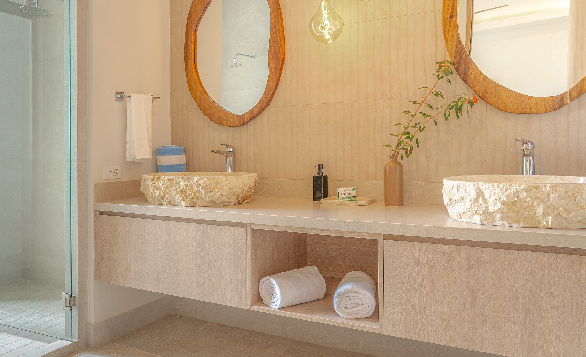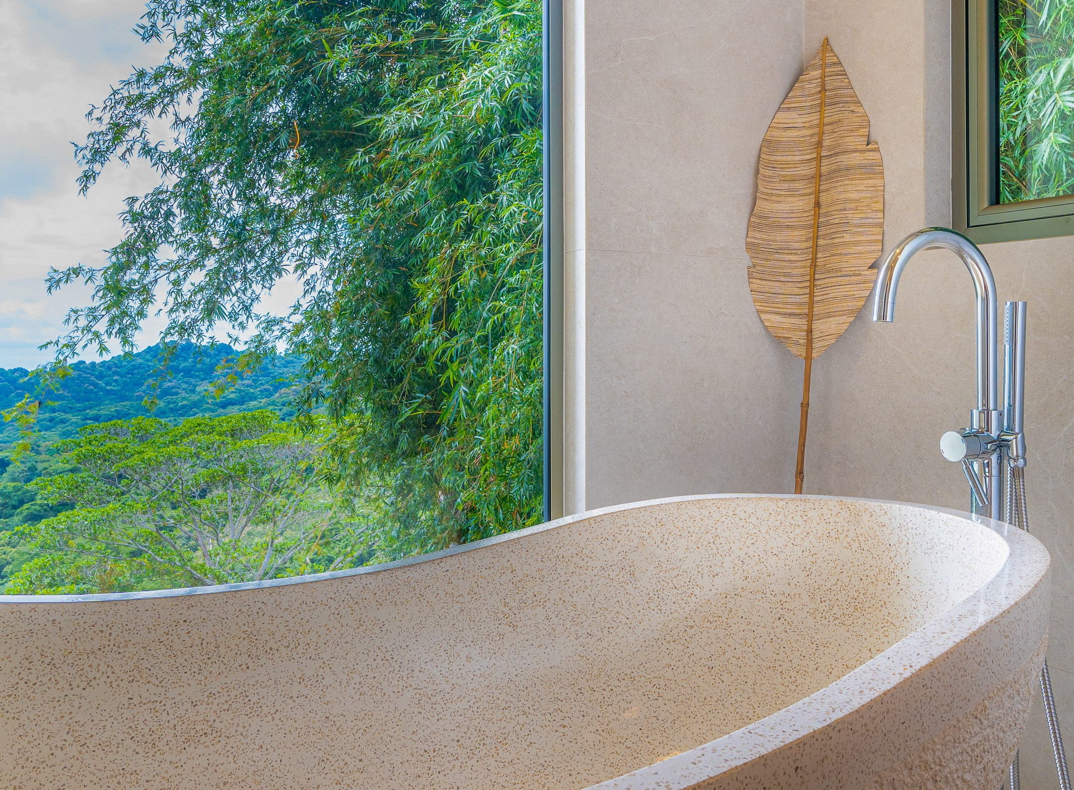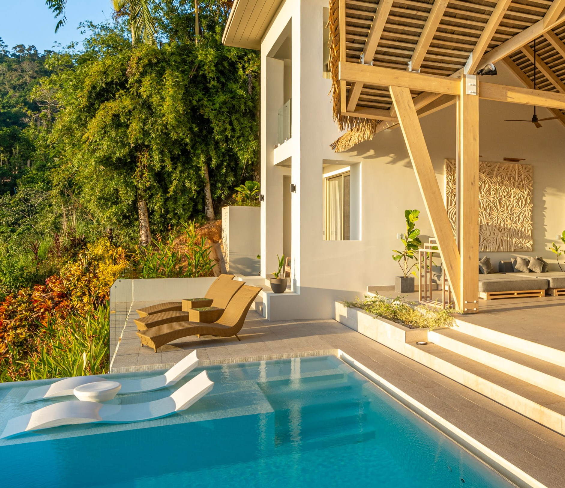 A separate three-bedroom guest home sits on its own private pocket of land. It works beautifully as a rental or as extra space for retreats and gatherings. The outdoor shower is a signature experience. It faces a forested creek, so guests rinse under the sky with nothing but the sound of water below and jungle around them. Together, the two homes create a seven-bedroom compound that can serve as a luxury vacation rental, a wellness or yoga retreat center, or a long-term family haven with ample hosting space.