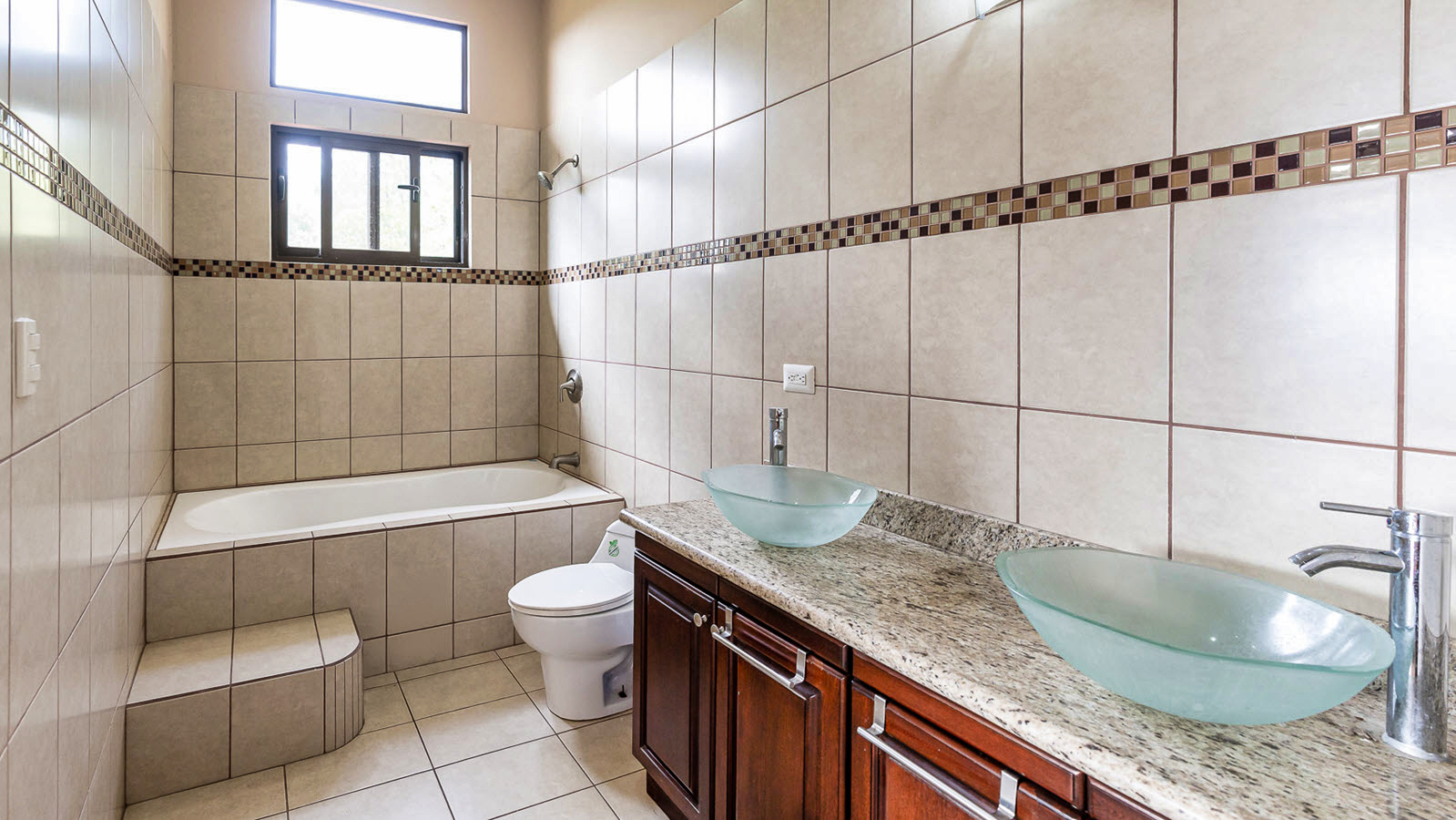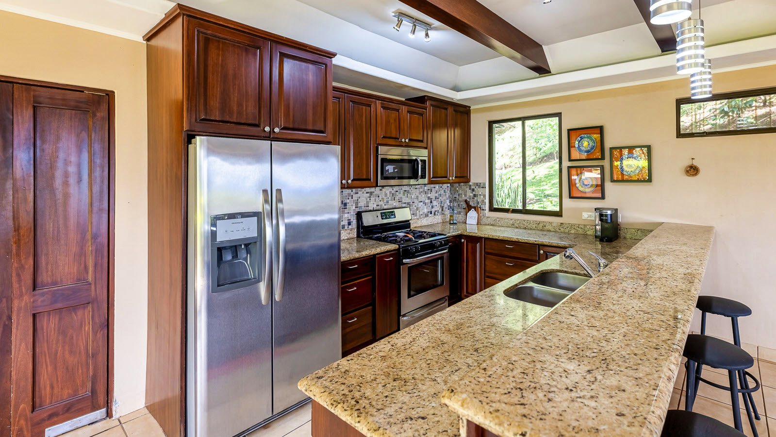Altogether, the home includes two bathrooms downstairs, a master ensuite and guest bath upstairs, plus a convenient half-bath in the pool area.