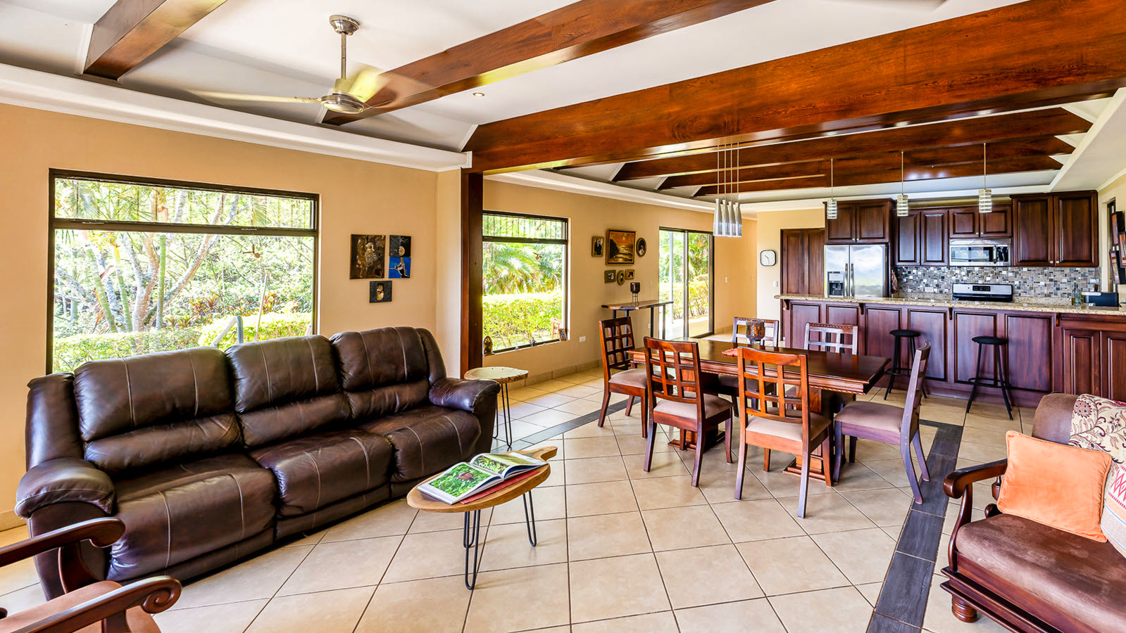 The fully equipped kitchen features a refrigerator, gas stove, microwave, dishwasher, and a large walk-in pantry — ideal for those who love to cook and entertain. The adjacent living and dining area includes a custom-built dining table with six chairs, a large leather reclining couch, and hardwood chairs with Obus-form cushions. Expansive patio doors frame the surrounding landscape, seamlessly blending indoor and outdoor living.
