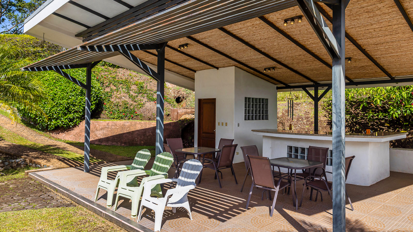 The 500-square-foot rancho sits at pool level and creates a tropical entertaining space perfect for gatherings or quiet afternoons. With a large granite countertop, covered seating area, and its own half-bath, this space invites you to live outdoors year-round.