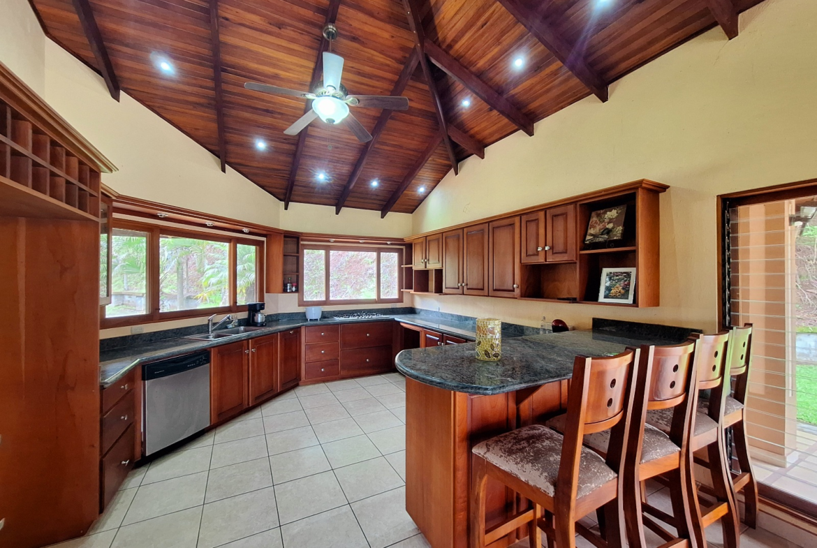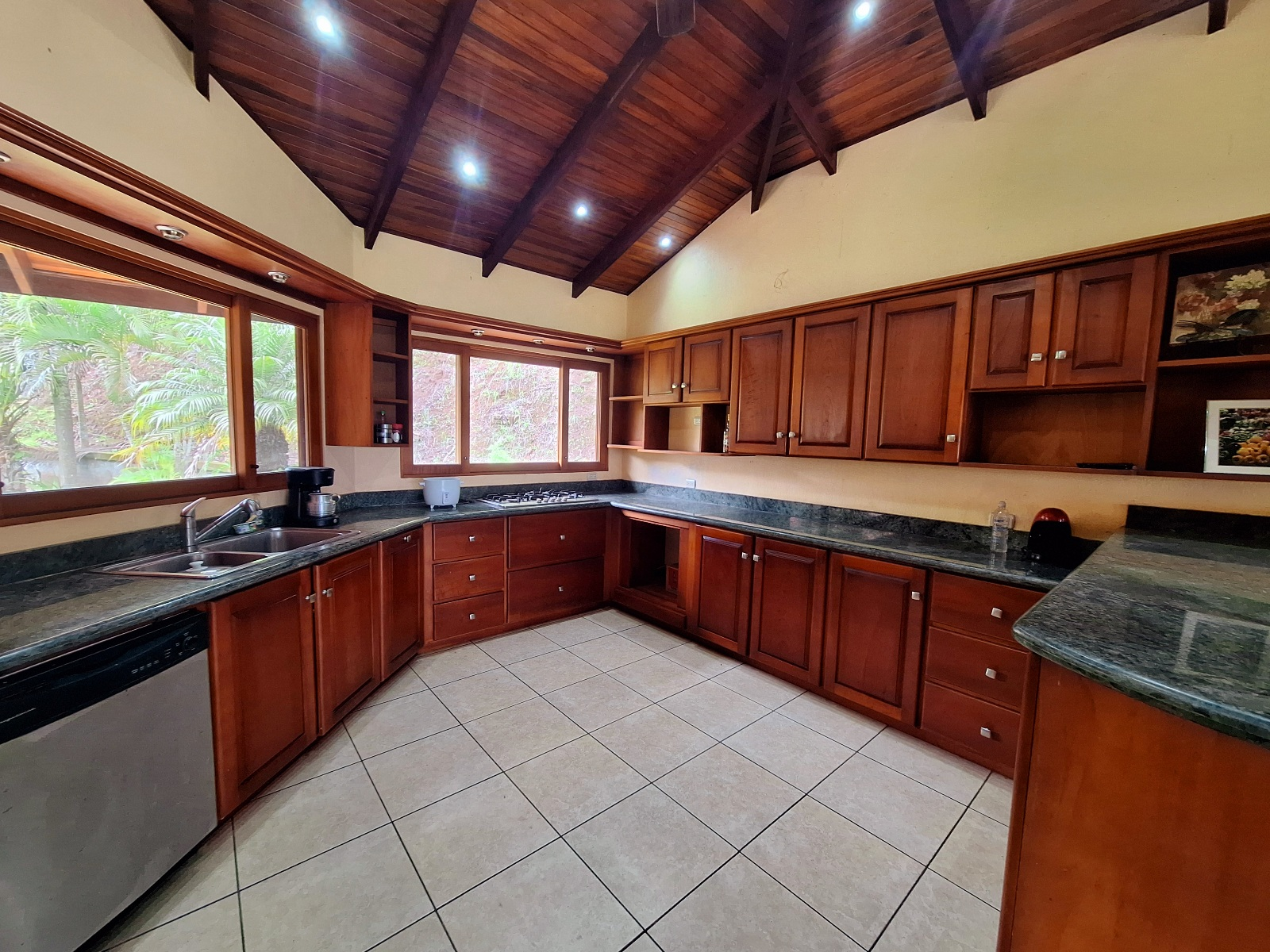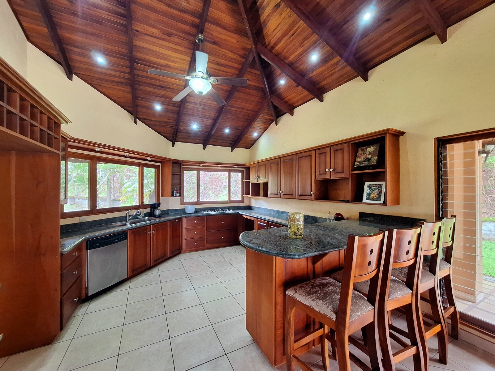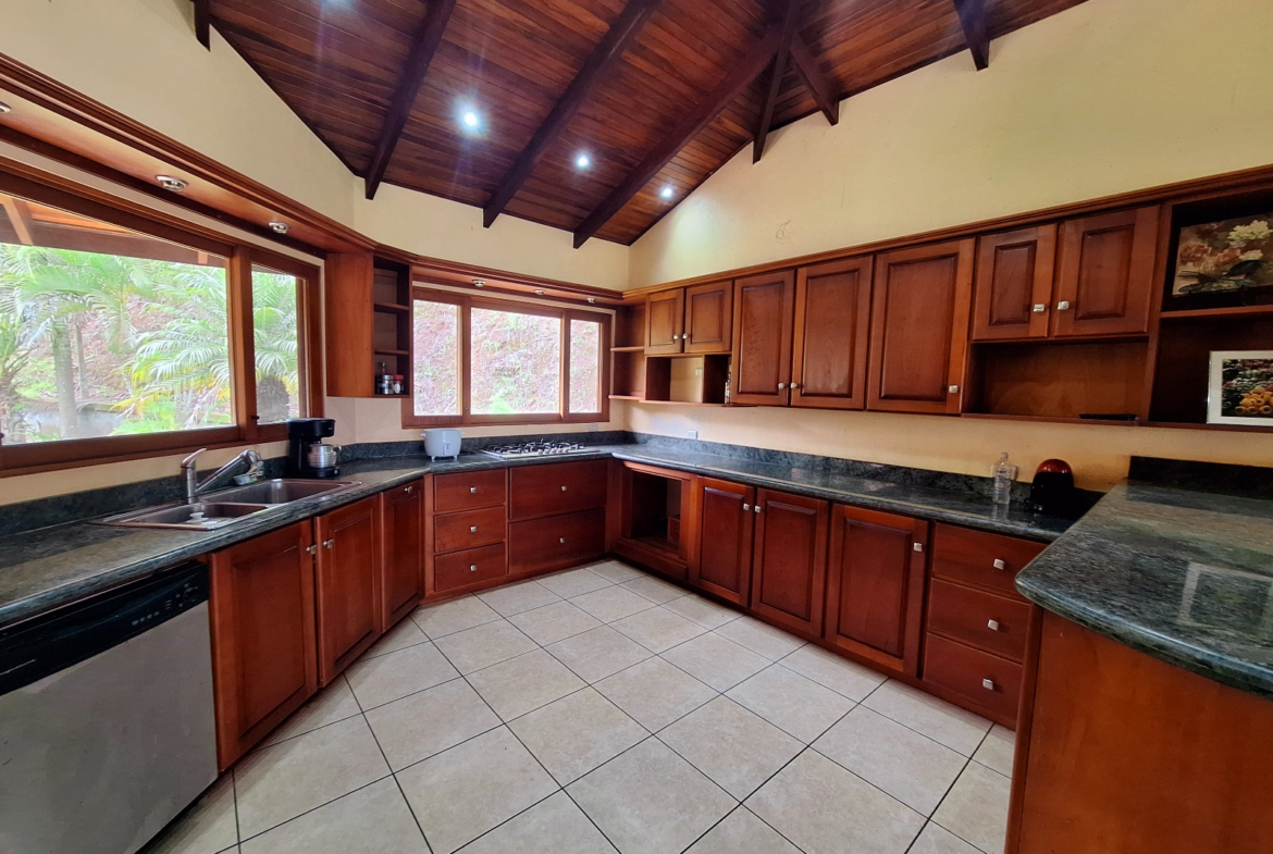 The main house boasts a spacious living area, a large u-shaped kitchen with ample countertop space, custom-build solid wood cabinetry, and an elevated breakfast bar, plus an expansive covered porch with stunning views. There is a generous master bedroom with a walk-in closet and an en-suite bathroom. The main house is equipped with 2 bathrooms, one with a large walk-in shower and the other one with a soaking tub.