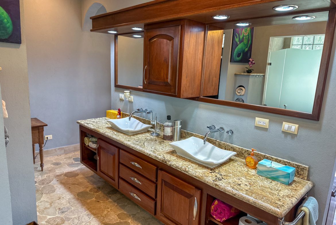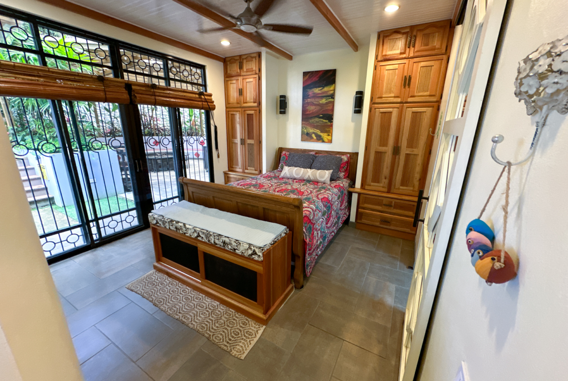 House #2, which can serve as a guest rental or part of a family compound, is built to high-quality American standards. It includes three bedrooms with en-suite bathrooms, a separate office, and a modern kitchen with a quartz countertop/bar area. The house also features a large wrap-around covered patio, motorized gate-covered parking, and a separate building with storage and a game room. The luxurious outdoor entertainment area includes a covered hot tub, gas fire pit, outdoor kitchen, and a professionally landscaped garden that enhances the tropical ambiance.