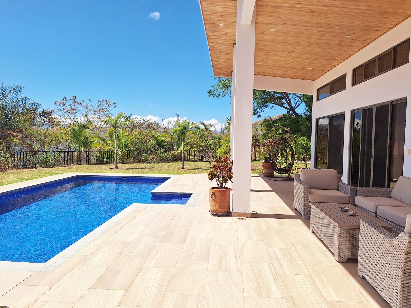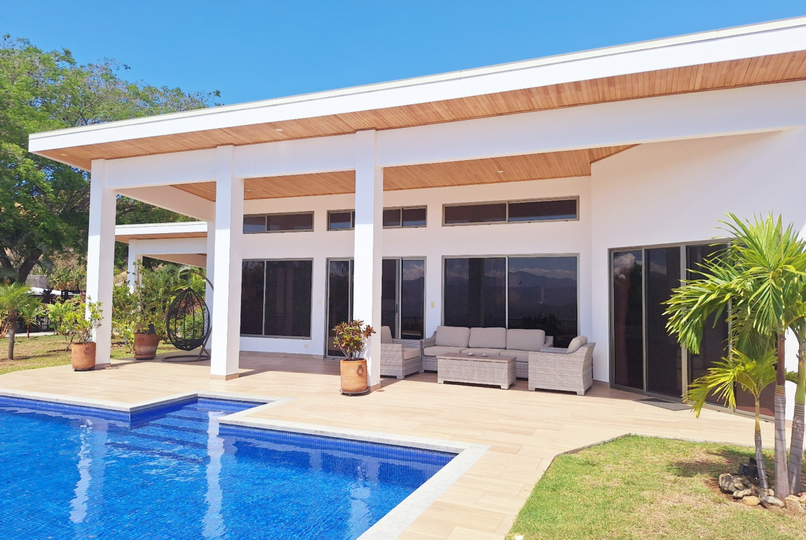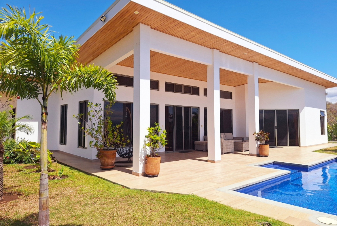 The indoor living space flows effortlessly toward the outdoor areas, where you can relax, entertain, and enjoy the peaceful surroundings. The outside is as spectacular as the inside; the sparkling tiled pool, accessible directly from the patio, and the colorful landscaped gardens make the picture complete. Relax or exercise at the pool or enjoy the tropical gardens, take in the breathtaking views of the central valley, the city lights, and several distant volcanoes – this is the lifestyle you deserve.