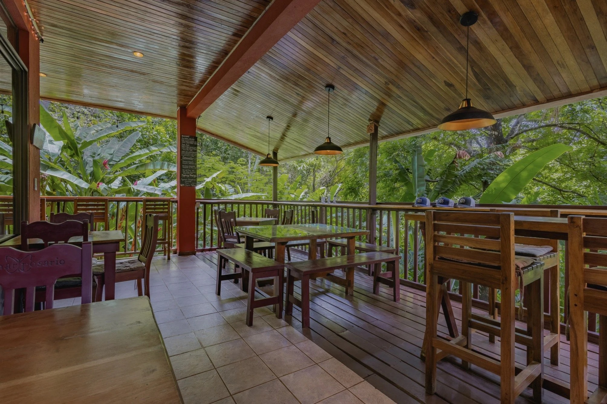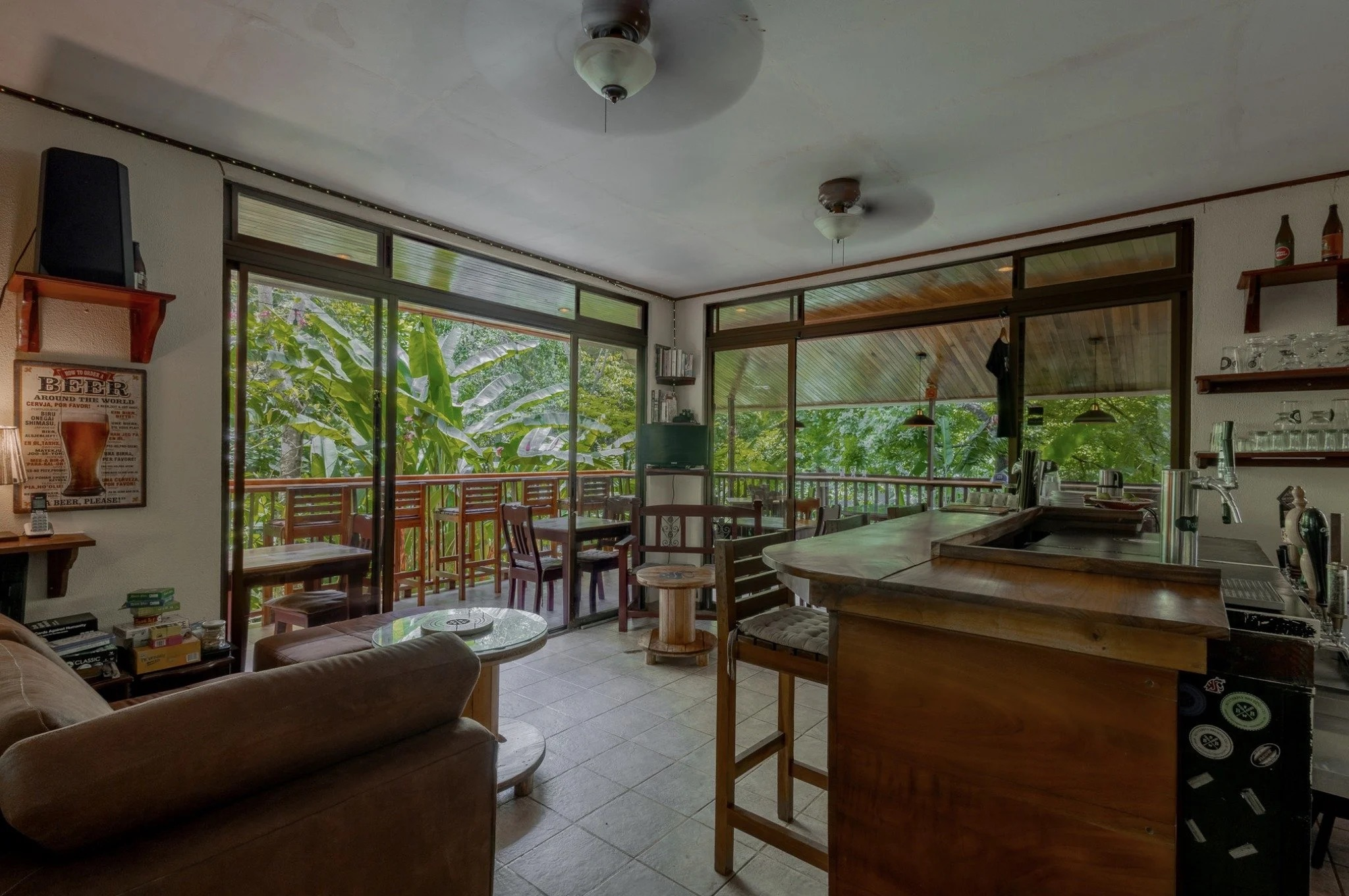 The ground level of the main building houses a fully licensed restaurant and bar featuring a ten-tap beer and soda system, along with a souvenir shop, office space, and two restrooms. A large deck with seating for up to 35 guests overlooks the jungle, where visitors can often spot howler monkeys and other wildlife while dining.