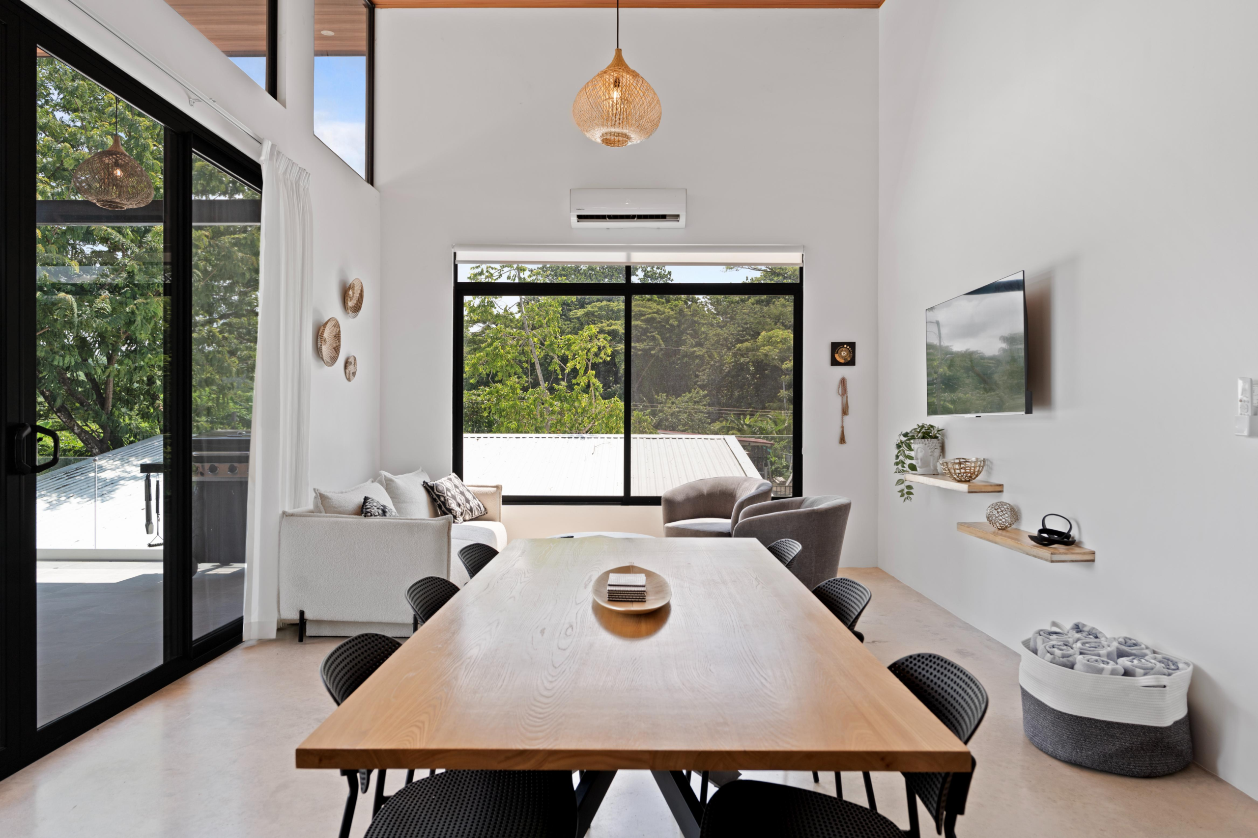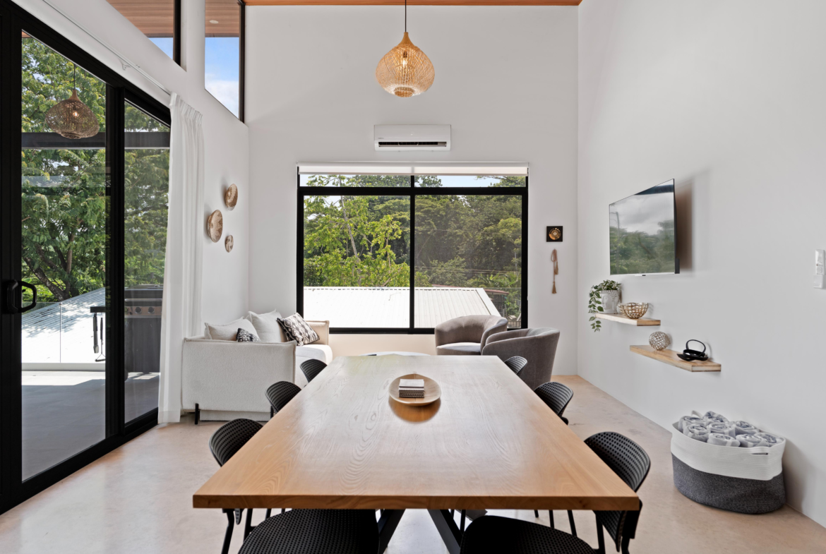 The property is thoughtfully designed as two independent residences. The upper-level home, features three bedrooms and three bathrooms, an open-concept living space, and a private balcony overlooking lush greenery. The ground-floor home, also offers three bedrooms and three bathrooms, with expansive sliding doors that connect seamlessly to a shaded patio and the pool area. In total, the property provides six bedrooms and six bathrooms, comfortably accommodating up to 14 guests while maintaining privacy and separation for multiple families or groups.