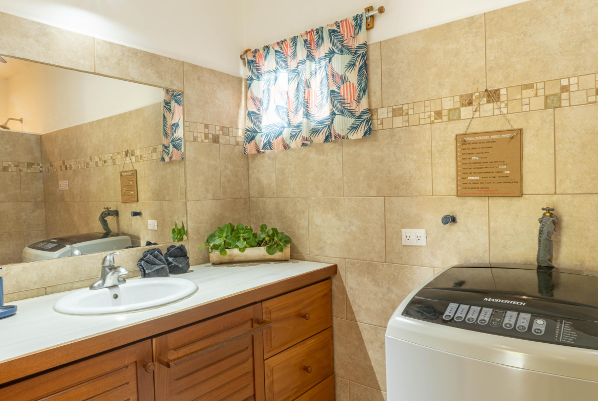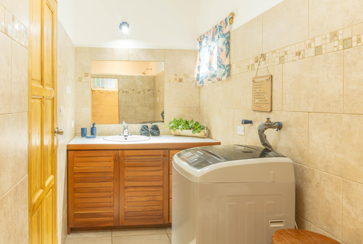 At the rear of the property is a dedicated laundry and storage room with a washing machine, dryer, and a separate toilet, adding convenience for owners and/or cleaning staff.