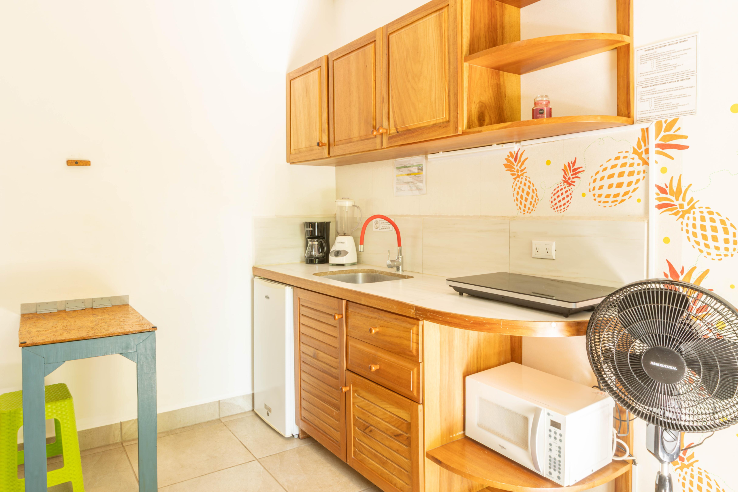 The property is thoughtfully designed across two levels. The ground floor features three separate one-bedroom apartments, each with a private bathroom, a fully equipped kitchen, and a private outdoor patio. Two of the apartments can be combined into a single larger unit via an adjoining door, providing flexible rental configurations. All units are equipped with orthopedic mattresses, air conditioning, ceiling fans, hot water, screened windows and doors, televisions, drying racks, and security safes. Two of the apartments also include automatic washing machines.