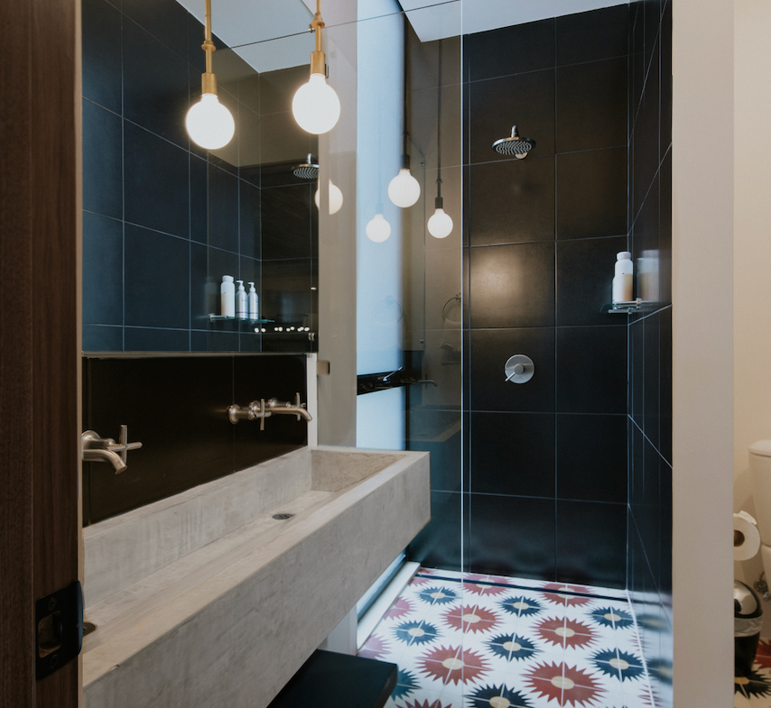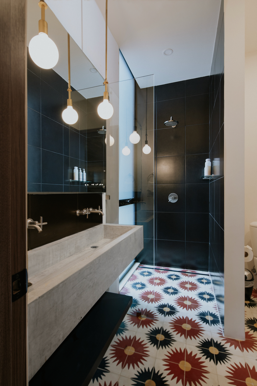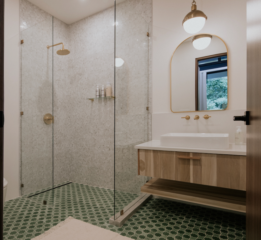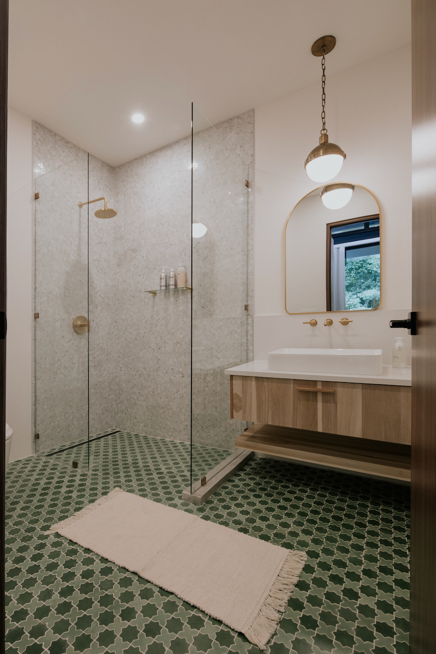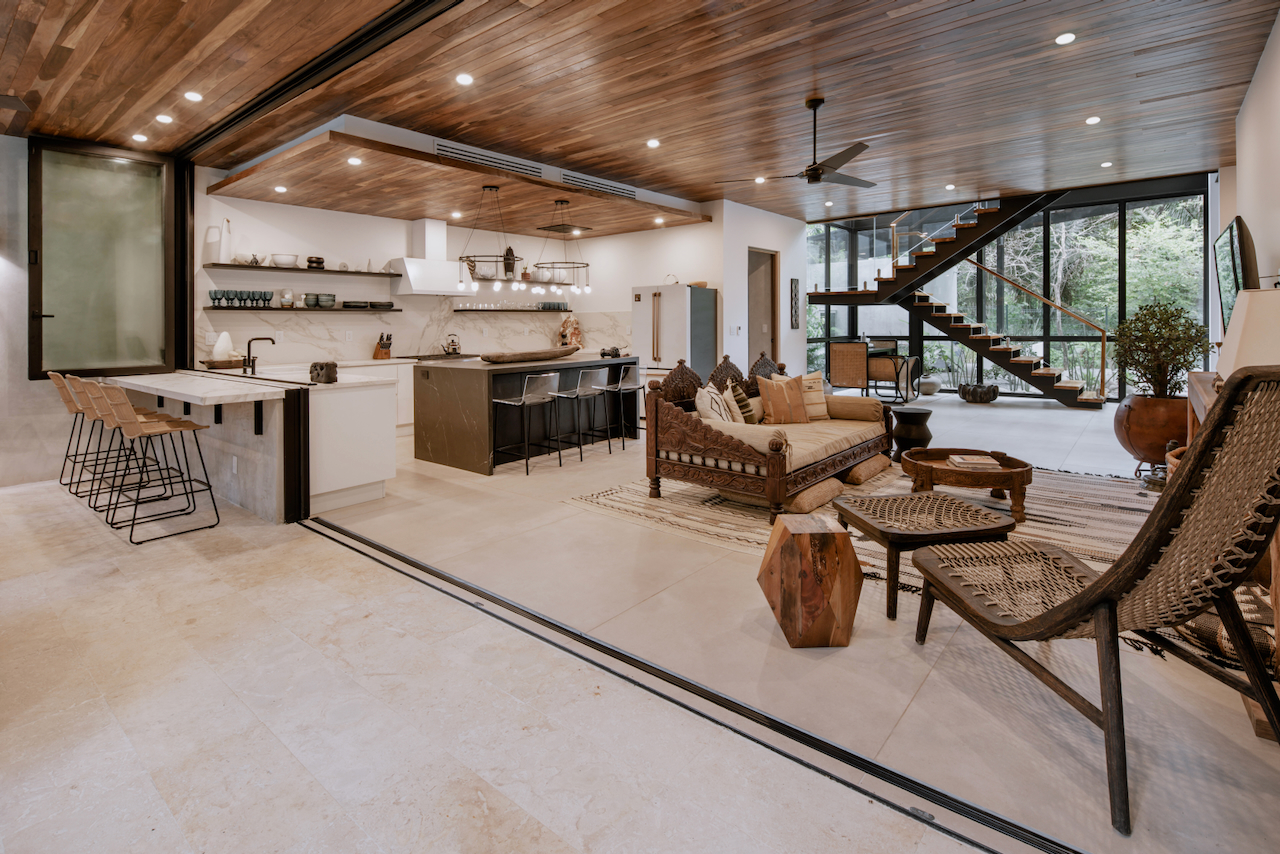 Upon entering, experience this 2800-square-foot home’s expansive design, where a large open living, kitchen, and dining area seamlessly transitions outdoors through accordion windows.
