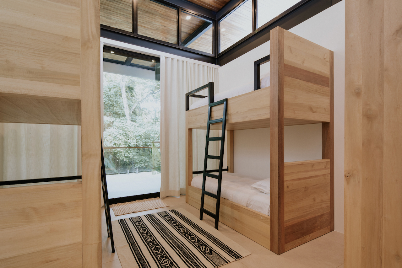 There are two bedrooms, including one with a queen bed, an en-suite bathroom with a private balcony, and a bunk room with built-in bunks (four beds), each with a reading light and outlet. The bunk room also has a private balcony overlooking the pool and jungle.