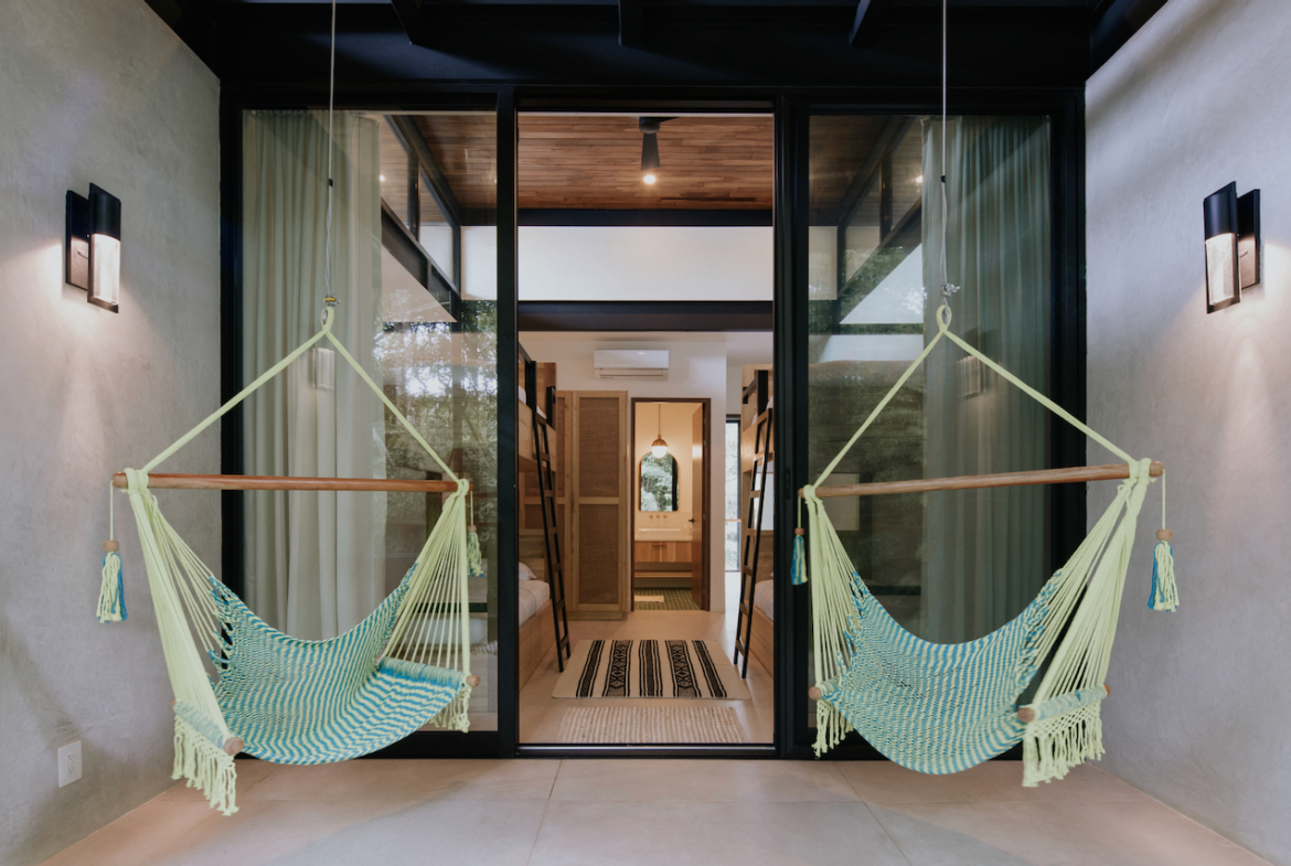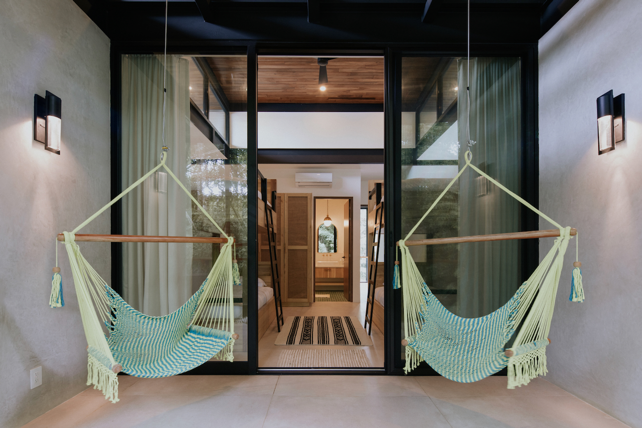 The master suite offers a king bed, en-suite bathroom, and a balcony with a swing bed overlooking the pool and jungle. A bunk room features built-in bunks (four beds), an en-suite bathroom, and a balcony with swinging chairs. An additional bedroom provides a queen bed, en-suite bathroom, and a private balcony with pool and jungle views.